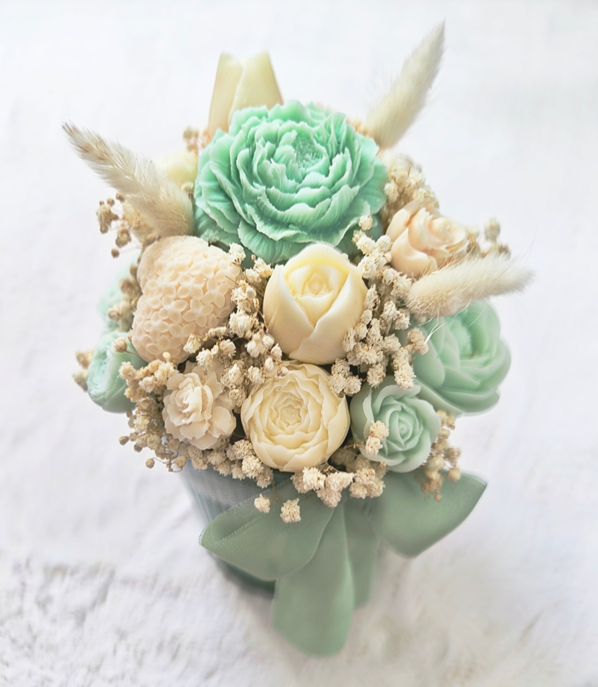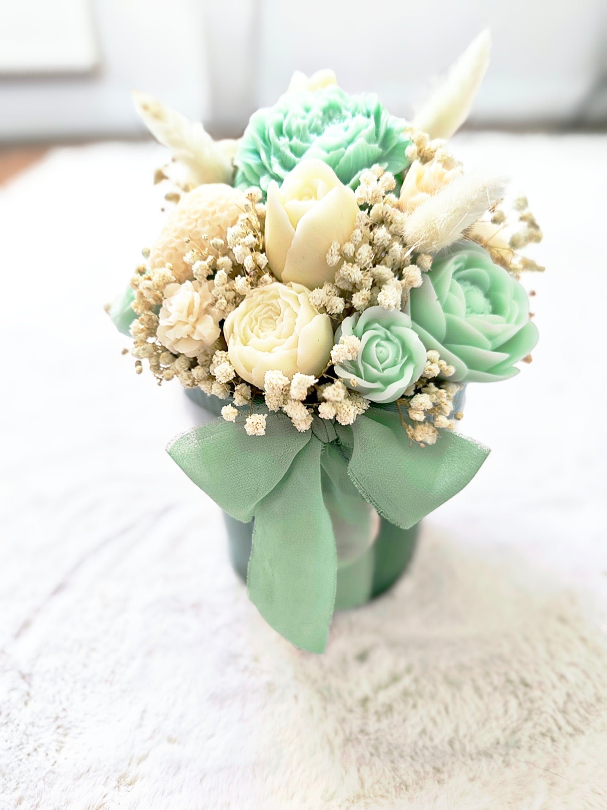 Un bouquet de fondants parfumés artisanal, dans de subtils tons vert et crème, pour une ambiance à la fois naturelle, poétique et romantique.